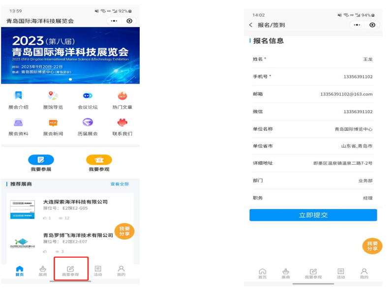 点击展商秀底边栏中央的【我要参会】按钮,直接报名参加青岛海科展,避免现场登记注册麻烦。提前预登记的观众还可以享有免费午餐等展会特权!