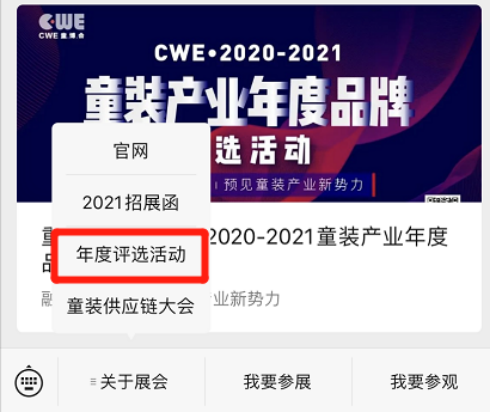 关注官方微信公众号”CWE童博会”,点击菜单栏“关于展会—年度评选活动”