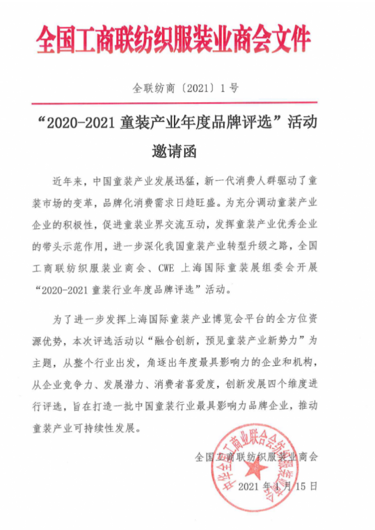 近年来,中国童装产业发展迅猛,新一代消费人群驱动了童装市场的变革,品牌化消费需求日趋旺盛。为充分调动童装产业企业的积极性,促进童装业界交流互动,发挥童装产业优秀企业的带头示范作用,进一步深化我国童装产业转型升级之路,全国工商联纺织服装业商会、CWE上海国际童装展组委会开展“2020-2021童装行业年度品牌评选”活动。